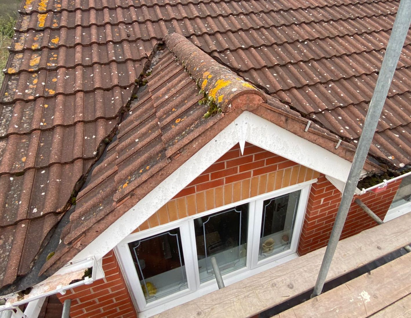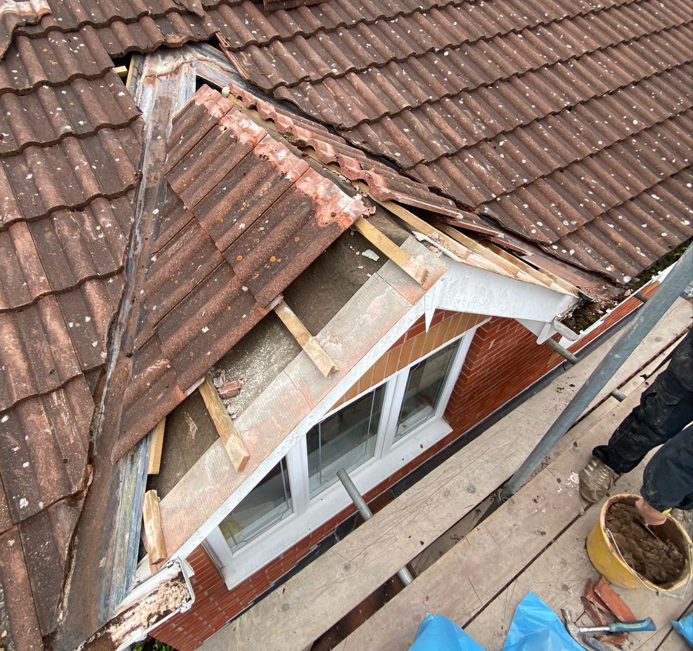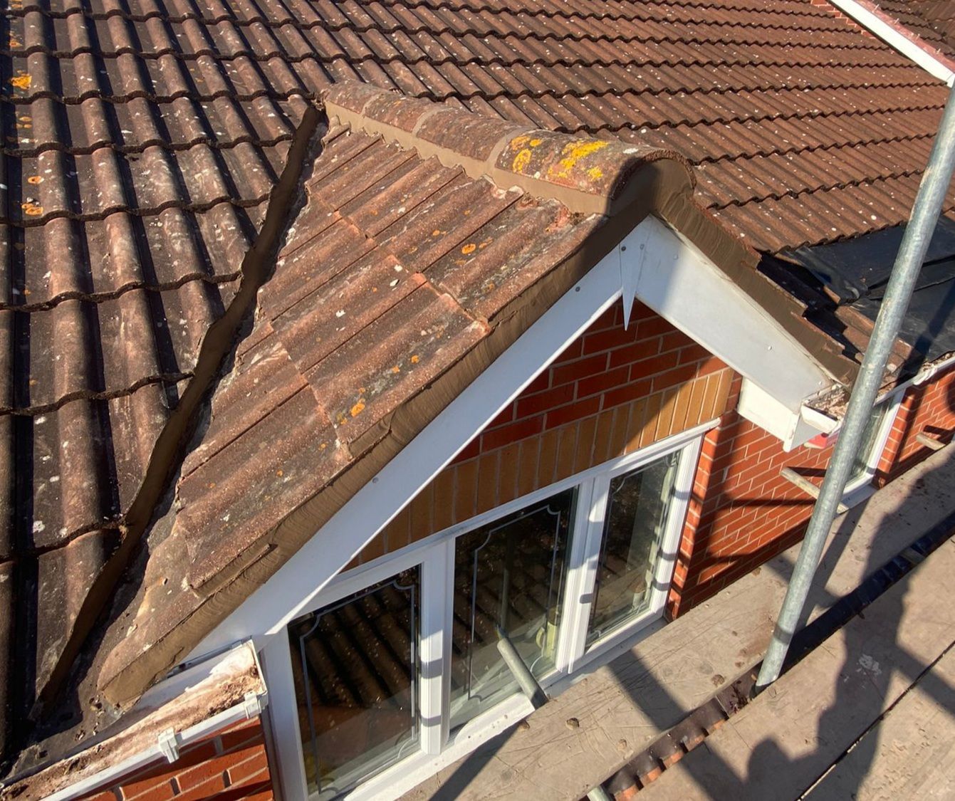 Description: To remove all valley, verge and ridge tiles on dormer. Then clean off all perished mortar supply and fit code 4 lead saddle replace broken tiles. Finally, re bed all valley verge and ridge tiles on dormer. Completed by Chad and Josh C in Bromsgrove.