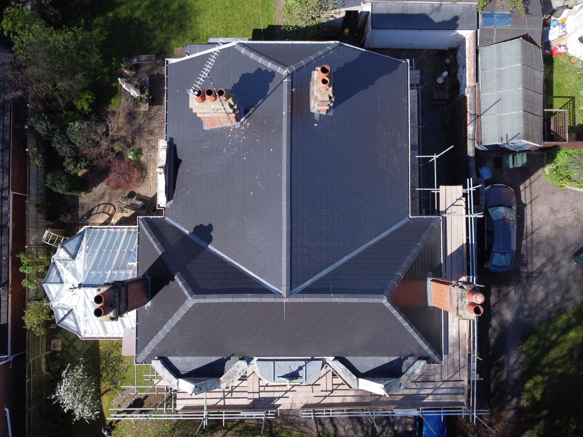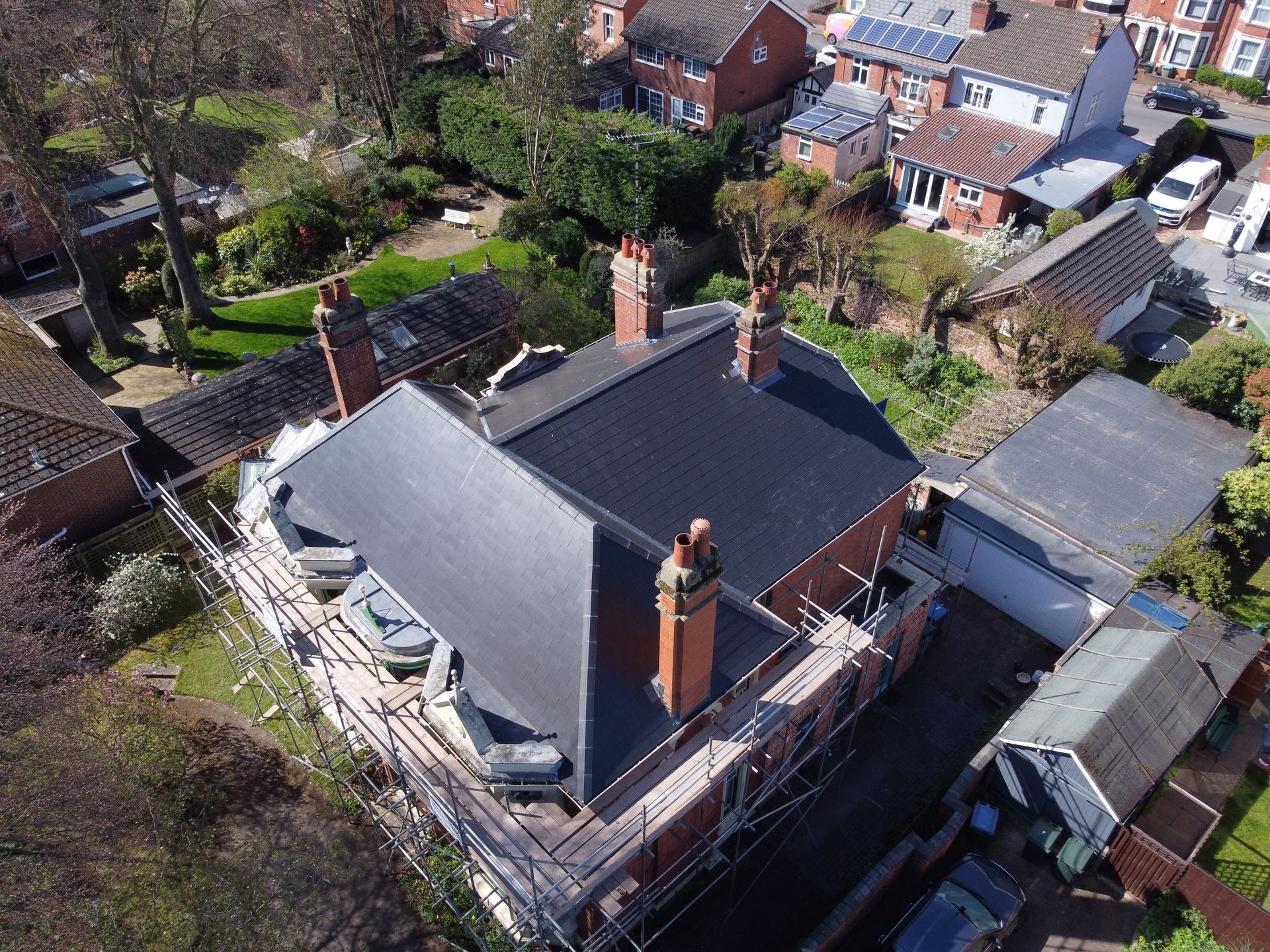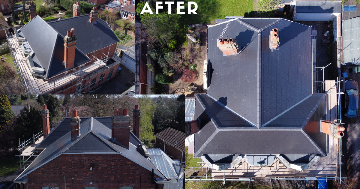 Description: Using Cement Fibre Slates, 4 Bespoke Chimneys, Lead Fabricated on Site