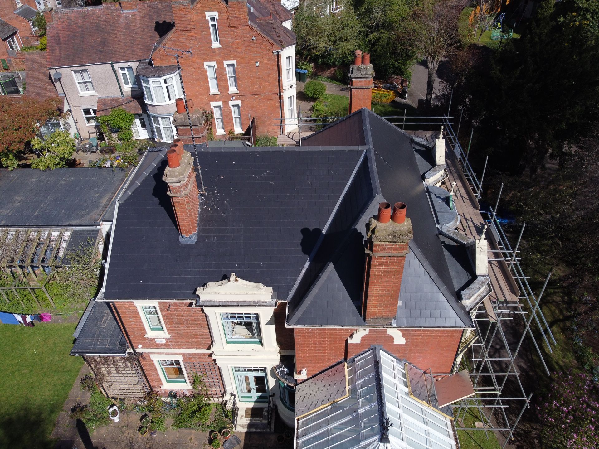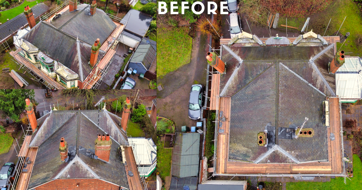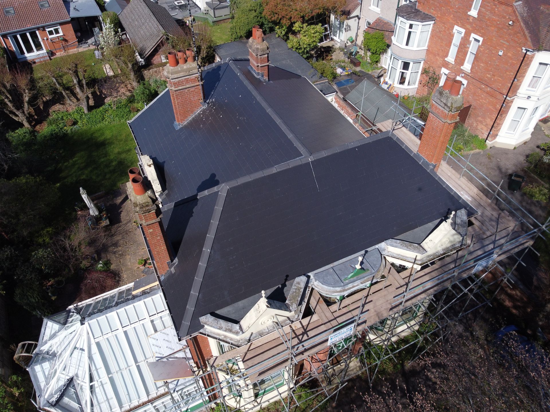 Description: Using Cement Fibre Slates, 4 Bespoke Chimneys, Lead Fabricated on Site
