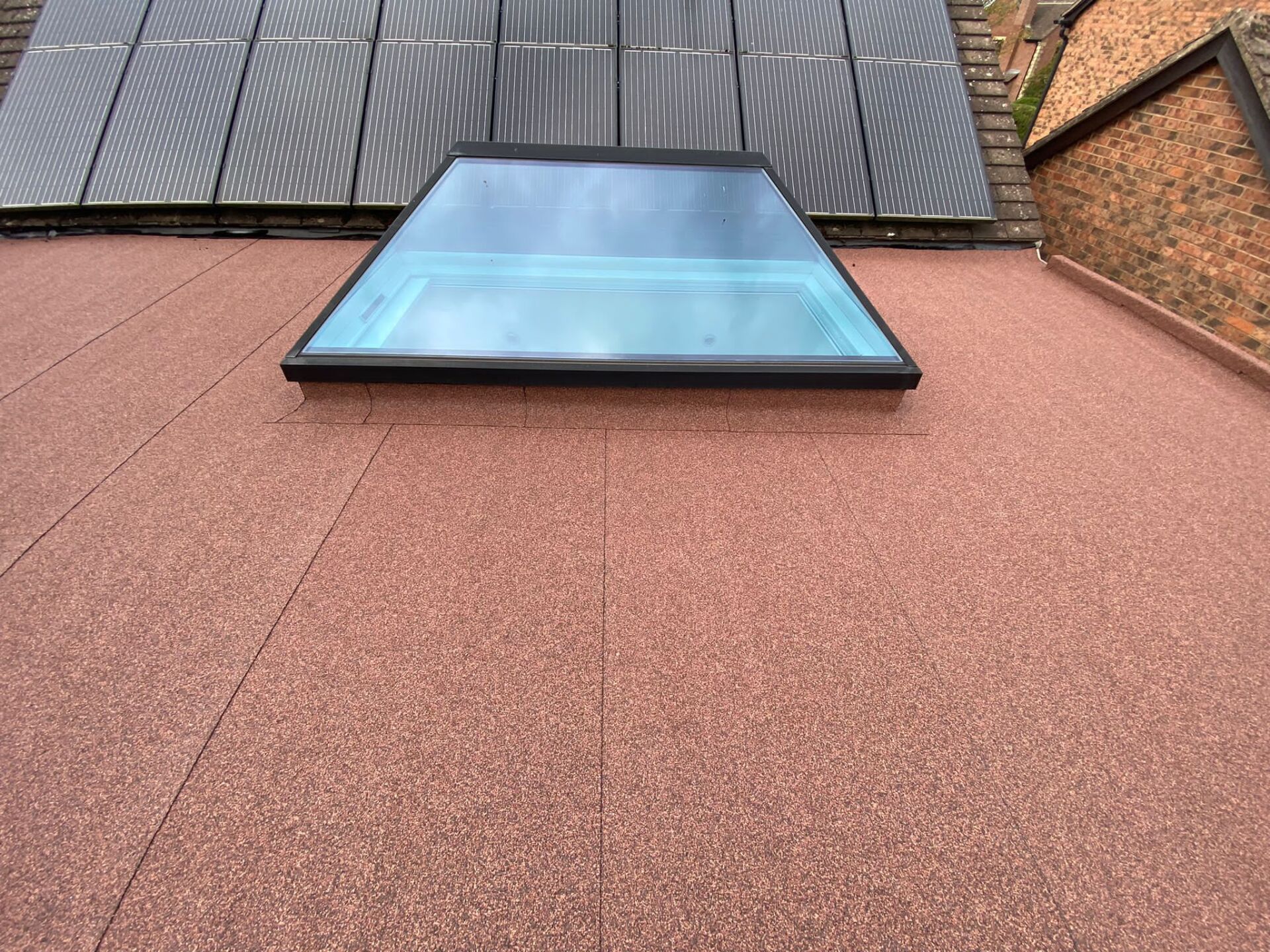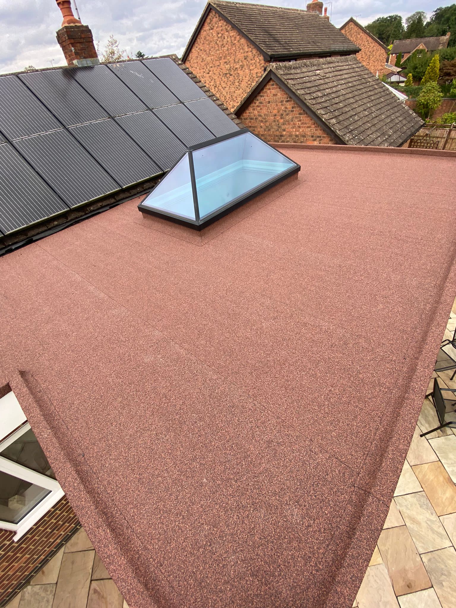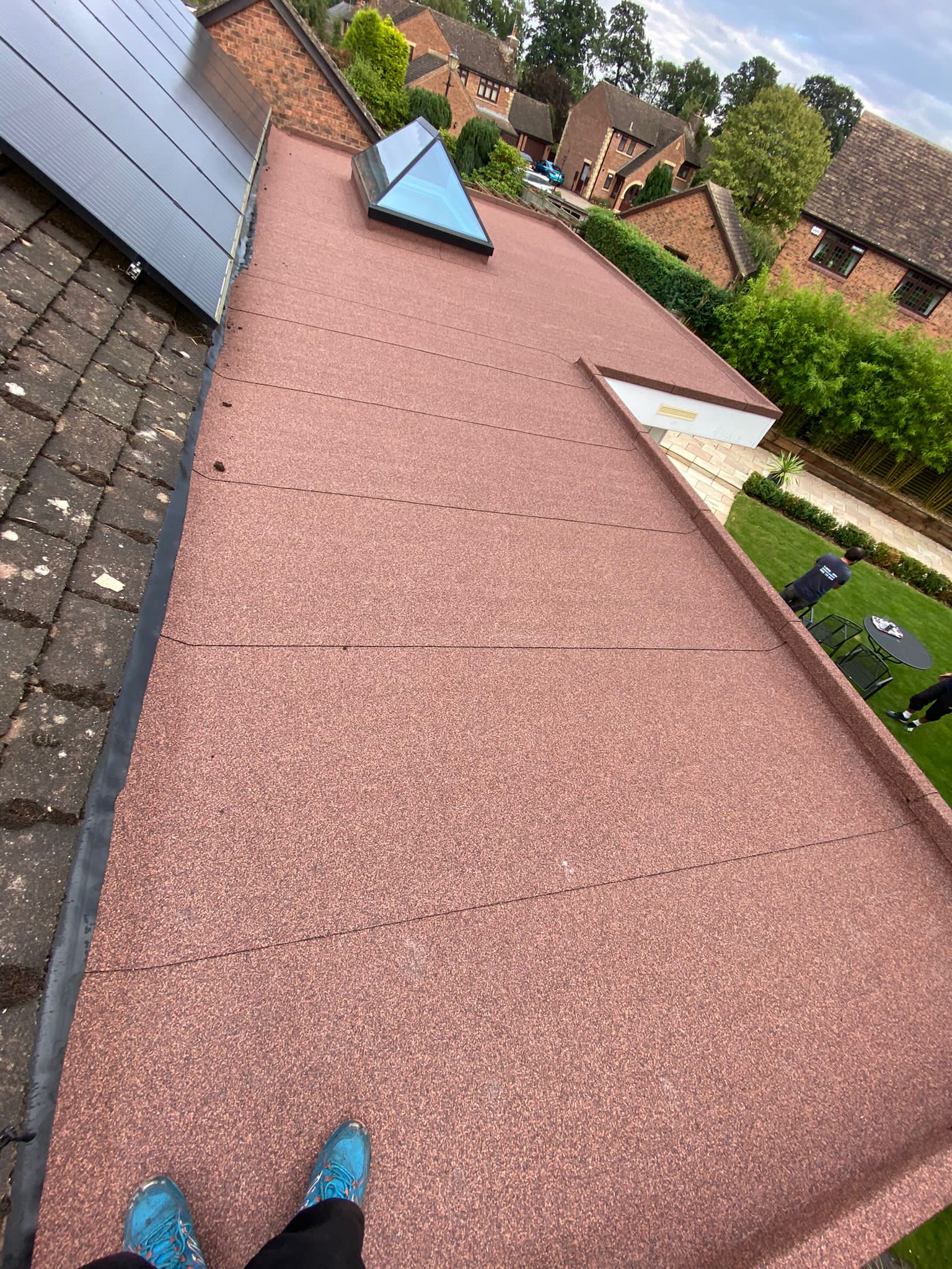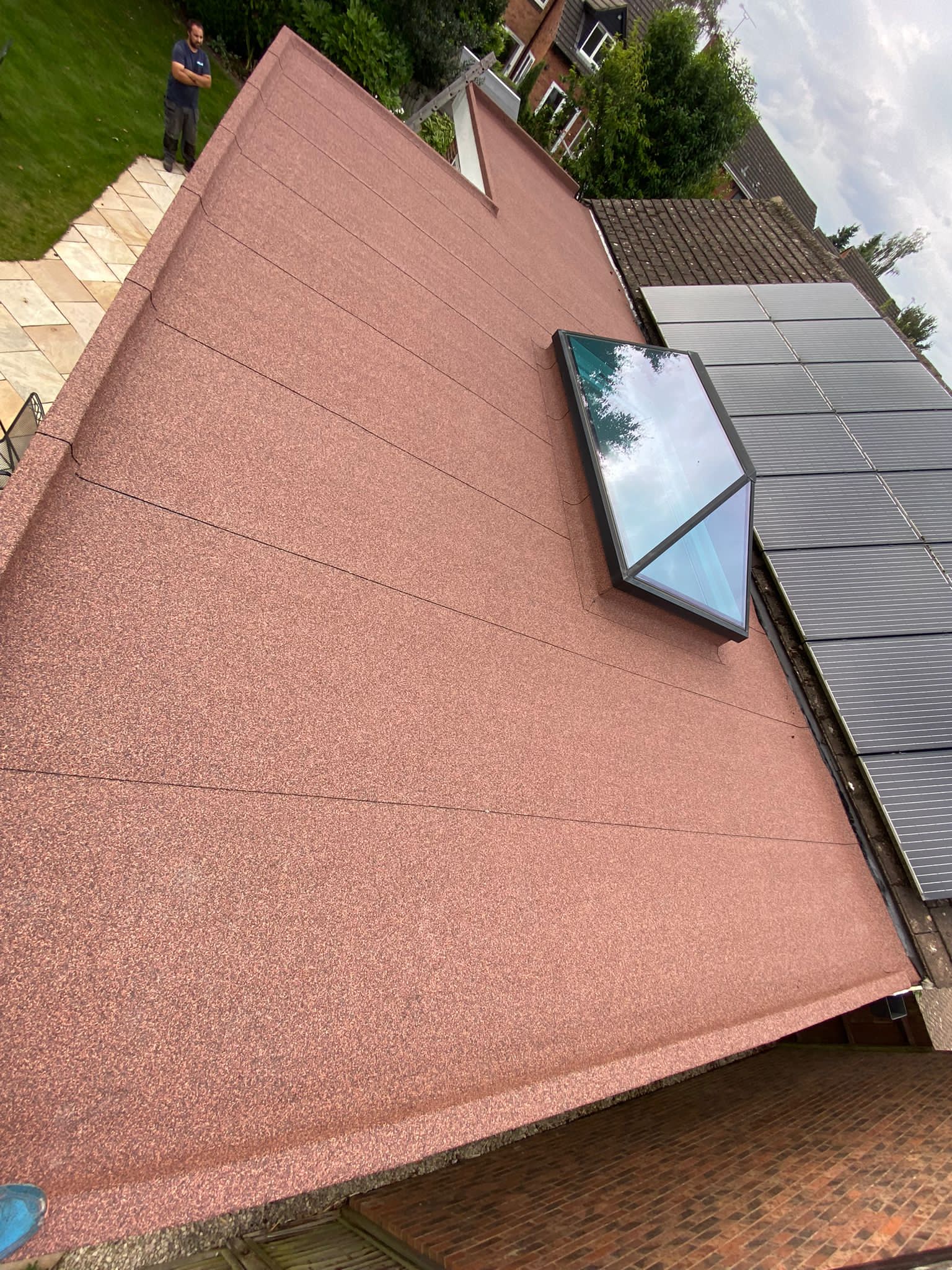 Description: Stripped off an older rubber roof, re-boarded with 3/4 inch ply board decking where necessary, felted using a bitumen layered bonding system, mineral finish (Red). Completed by Pablo & Alesson